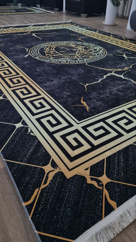 فرشینه مدرن مشکی طلایی طرح ورساچه، یکی از خاصترین انتخابها برای کسانی است که به دنبال دکوراسیون لوکس و متفاوت هستند.