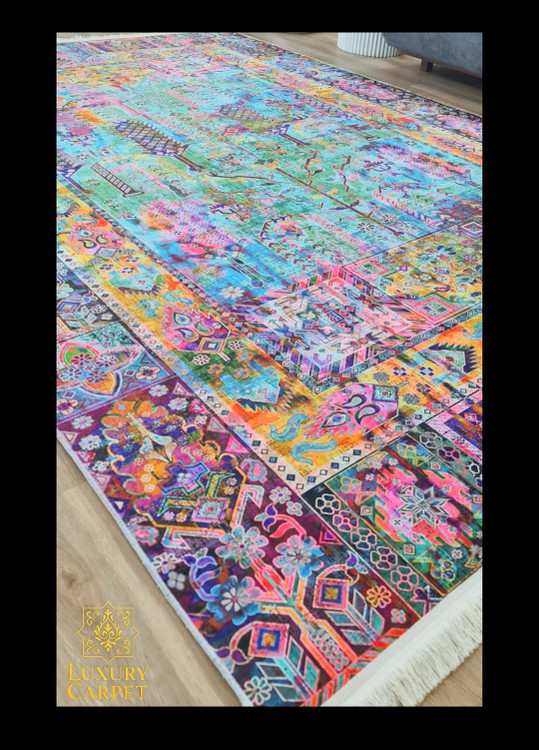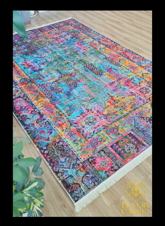 این فرشینه با طراحی خلاقانه و ترکیب رنگهای شاد و پرانرژی، انتخابی ایدهآل برای افرادی است که به دنبال ایجاد فضایی خاص و متفاوت در دکوراسیون منزل یا محل کار خود هستند. زمینهی آن با هارمونی رنگهایی چون آبی فیروزهای، صورتی، بنفش، نارنجی و زرد، جلوهای هنری و مدرن به فضا میبخشد و با سبکهای متنوع دکوراسیون از مینیمال تا بوهو و مدرن سازگار است.