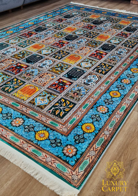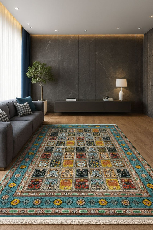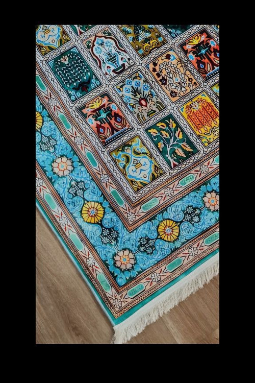این فرشینه سنتی با طراحی الهامگرفته از کاشیکاریهای ایرانی، ترکیبی از هنر اصیل و رنگبندی چشمنواز است. استفاده از رنگهای آبی فیروزهای، زرد، سبز و مشکی با جزئیات هنری، جلوهای خاص و منحصربهفرد به فضای شما میبخشد.