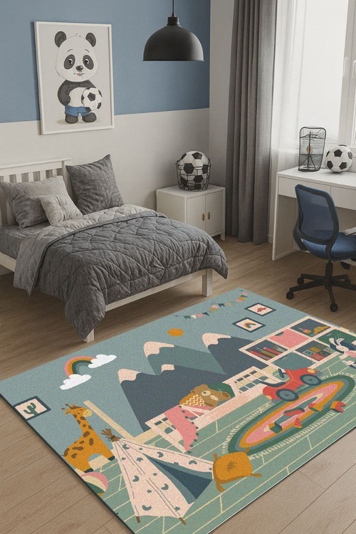 طرح فرشینه: کارتونی با تم طبیعت، کوهستان و حیوانات (زرافه، خرس، خرگوش)