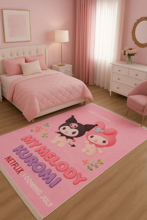 فرشینه My Melody & Kuromi با طراحی فانتزی و رنگبندی صورتی، انتخابی ایدهآل برای اتاقهای دخترانه و نوجوان است.