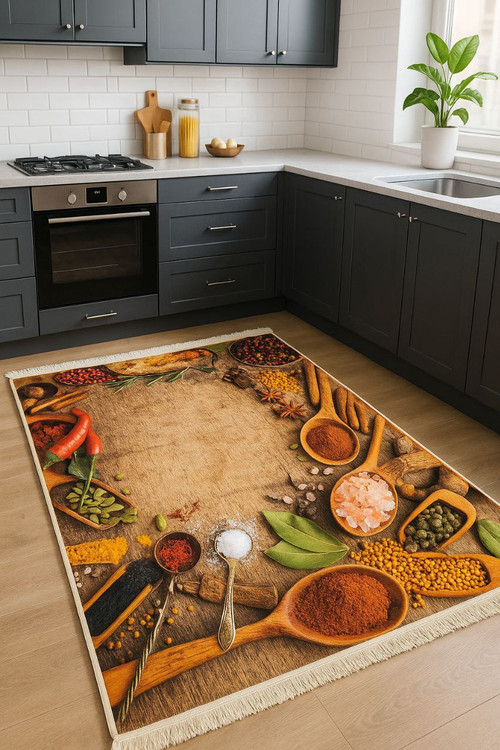 این فرشینه آشپزخانه با طراحی منحصربهفرد از انواع ادویهجات، فضایی گرم و دلنشین برای آشپزخانه شما ایجاد میکند.
