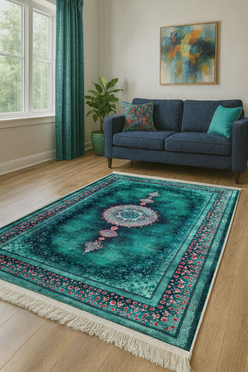 فرش لاکچری مدرن با رنگ فیروزهای خاص و طرحی منحصر بهفرد، انتخابی فوقالعاده برای خانههای شیک و مدرن است.