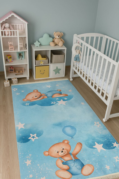 فرشینه کودک طرح خرس مهربان با طراحی فانتزی و رنگهای آرامشبخش آبی و صورتی، انتخابی ایدهآل برای اتاق نوزاد و کودک است.
