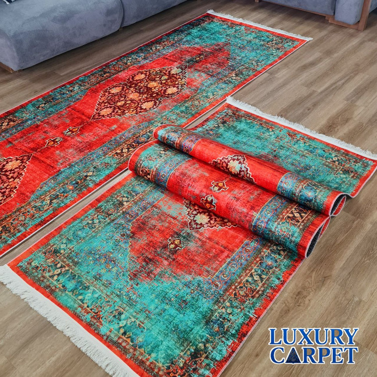 رنگبندی خاص ترکیب قرمز و فیروزهای، باعث شده این فرش به نقطه کانونی هر فضایی تبدیل شود.