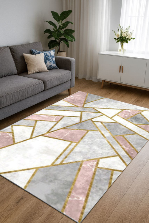 فرشینه مدرن هندسی با طراحی خاص و رنگبندی ملایم صورتی، طوسی و سفید همراه با خطوط طلایی، انتخابی بینظیر برای دکوراسیونهای مدرن و مینیمال است.